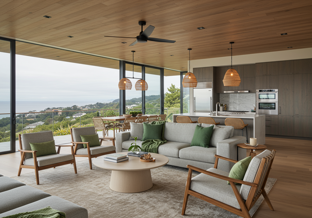 Spanning over 5,000 square feet at present, Casa Olas welcomes guests with a luminous, open layout that provides unobstructed vistas of the Pacific Ocean. This airy environment is furnished with a generously sized sectional sofa, modern sleek furniture pieces, elegant touches of stone and teak, and multiple sets of sliding glass doors that open up to the expansive balcony and pool area.